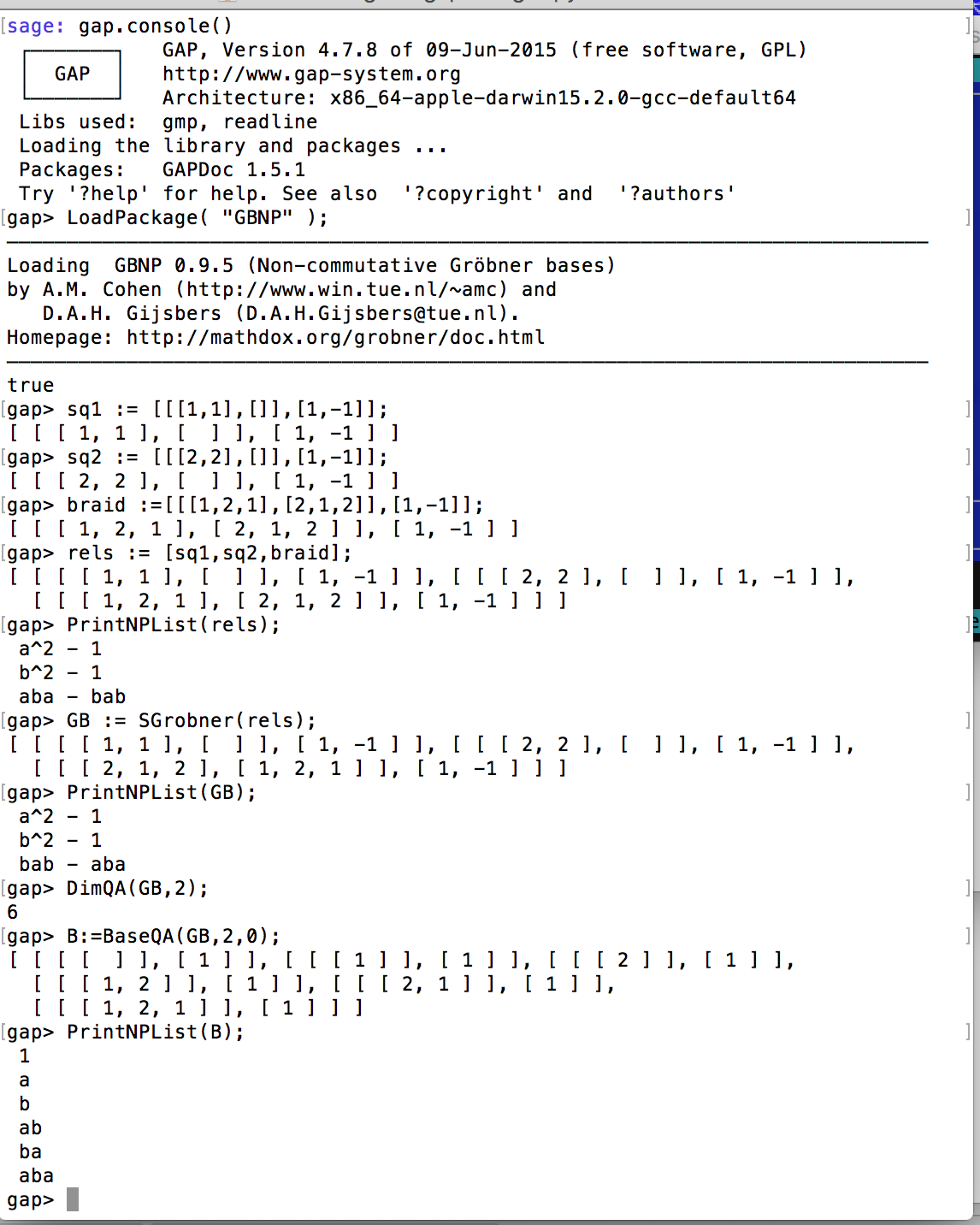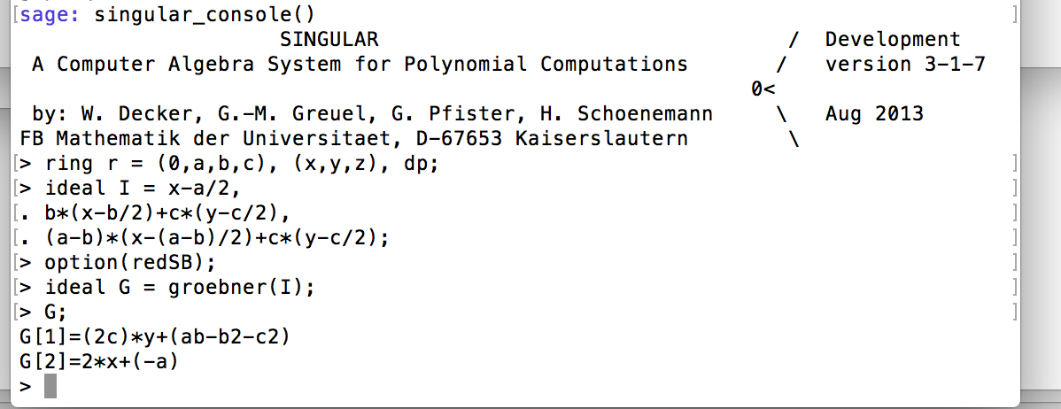 | 9 (04/02) | Basics of elimination theory. Examples of computer based calculations in the commutative and the noncommutative case (clickable for screenshots): elimination of variables in Magma, circumcentre of a triangle in Singular, group algebra of S3 in GAP. | [CLO, 3.1] | |